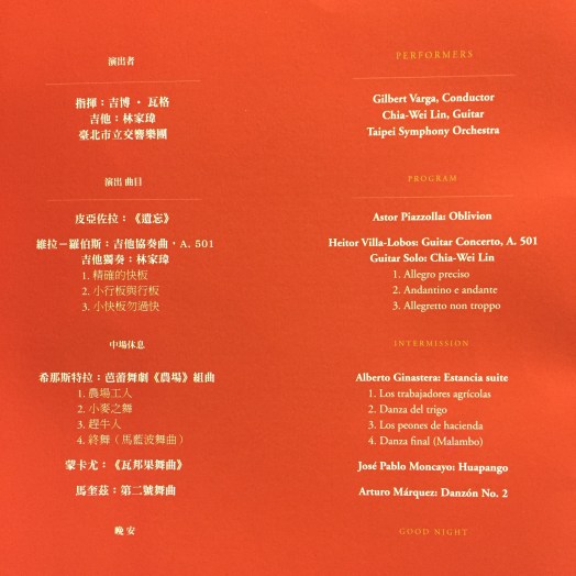 The centerpiece of the evening, though, was obviously the Villa-Lobos concerto, played by one young 林家瑋. Quite young, of small stature, and seemingly soft-spoken, Lin took his time to tune and get himself and his gear in the right place before he gave Varga the nod he was ready. All the brass had cleared off the stage, and we were left with a small compliment of strings, and only one of each woodwinds, horn and trombone. Even with the small ensemble, the guitar was still amplified with a mic, ever so subtly. Perhaps this is common.